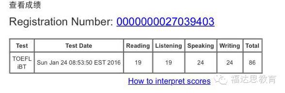 前几天成绩出来的时候,86分。(listening19,reading19, speaking24,writing 24)当时看到成绩觉得真的一时都缓不过来!我居然也能考过托福!!!!大学英语机选29分的玩家也能考过托福!